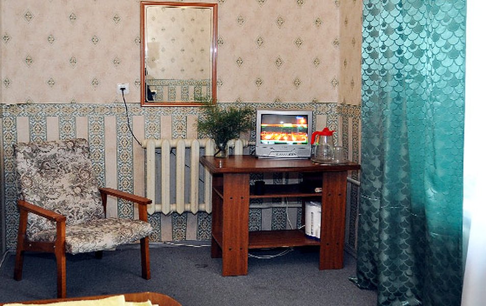 В номере: вешалка, кровать односпальная, прикроватные тумбочки, стулья, телевизор
