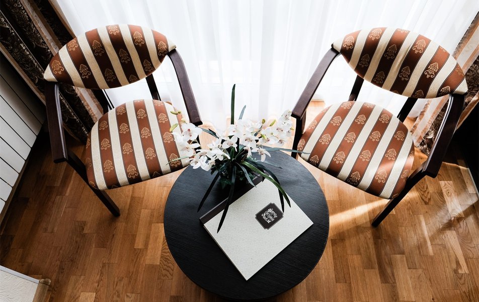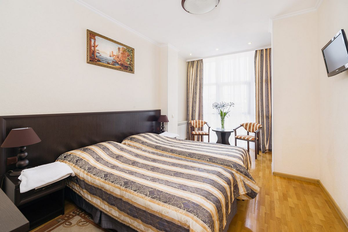 В номере: две односпальные кровати, прикроватные тумбы, шкаф-купе, зона отдыха с креслами и журнальным столиком, письменный стол, мини-холодильник, телевизор, кондиционер, сейф, набор посуды, телефон, Wi-Fi, в некоторых номерах есть балкон
