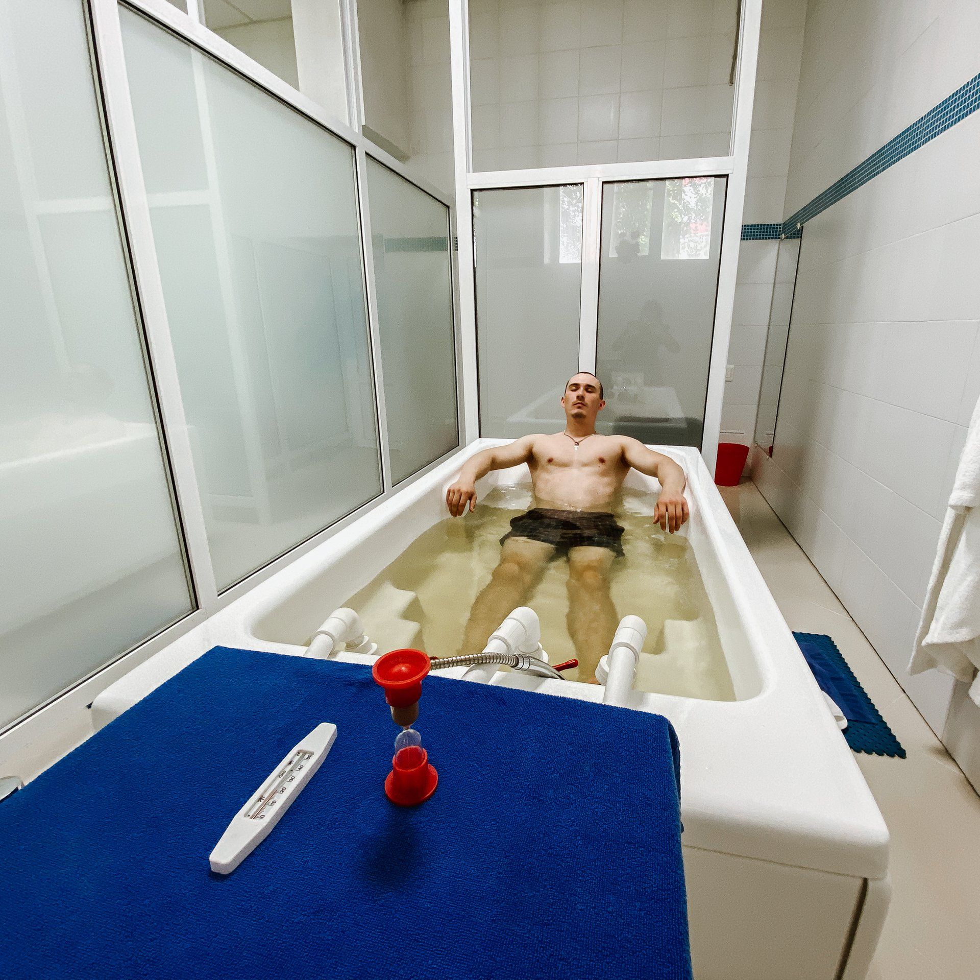 • Сеанс водных процедур или гидротерапия в соответствии с показаниями: подводный массаж, гидроэнергетический детокс, циркулярный или восходящий душ или обертывание растительными травами.